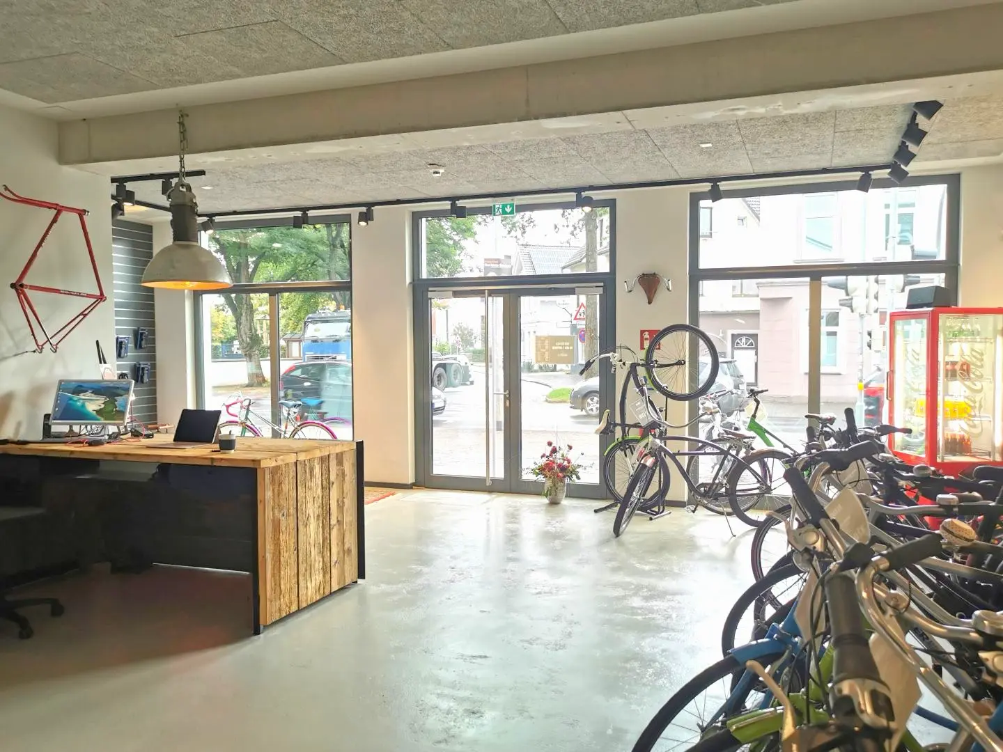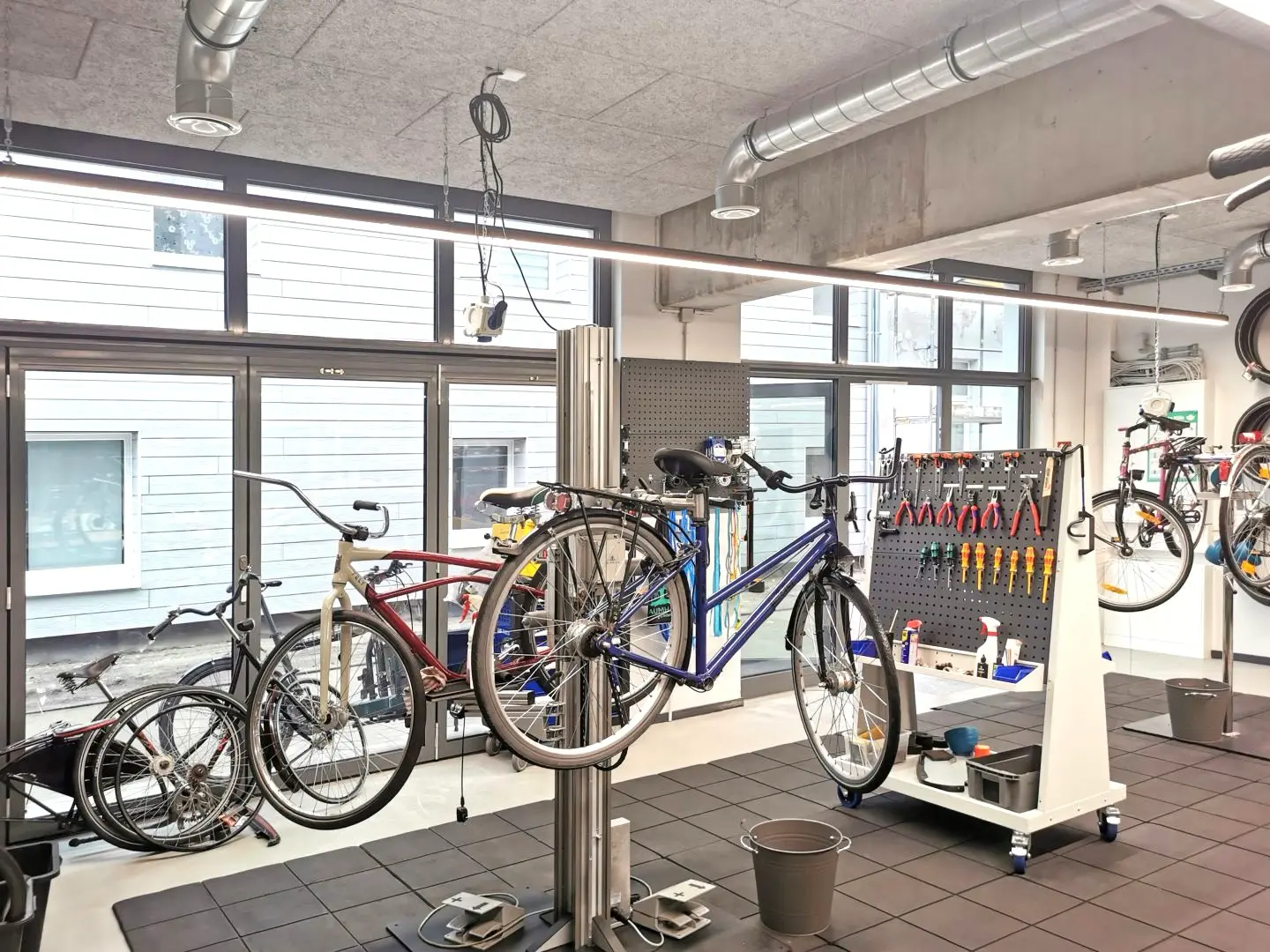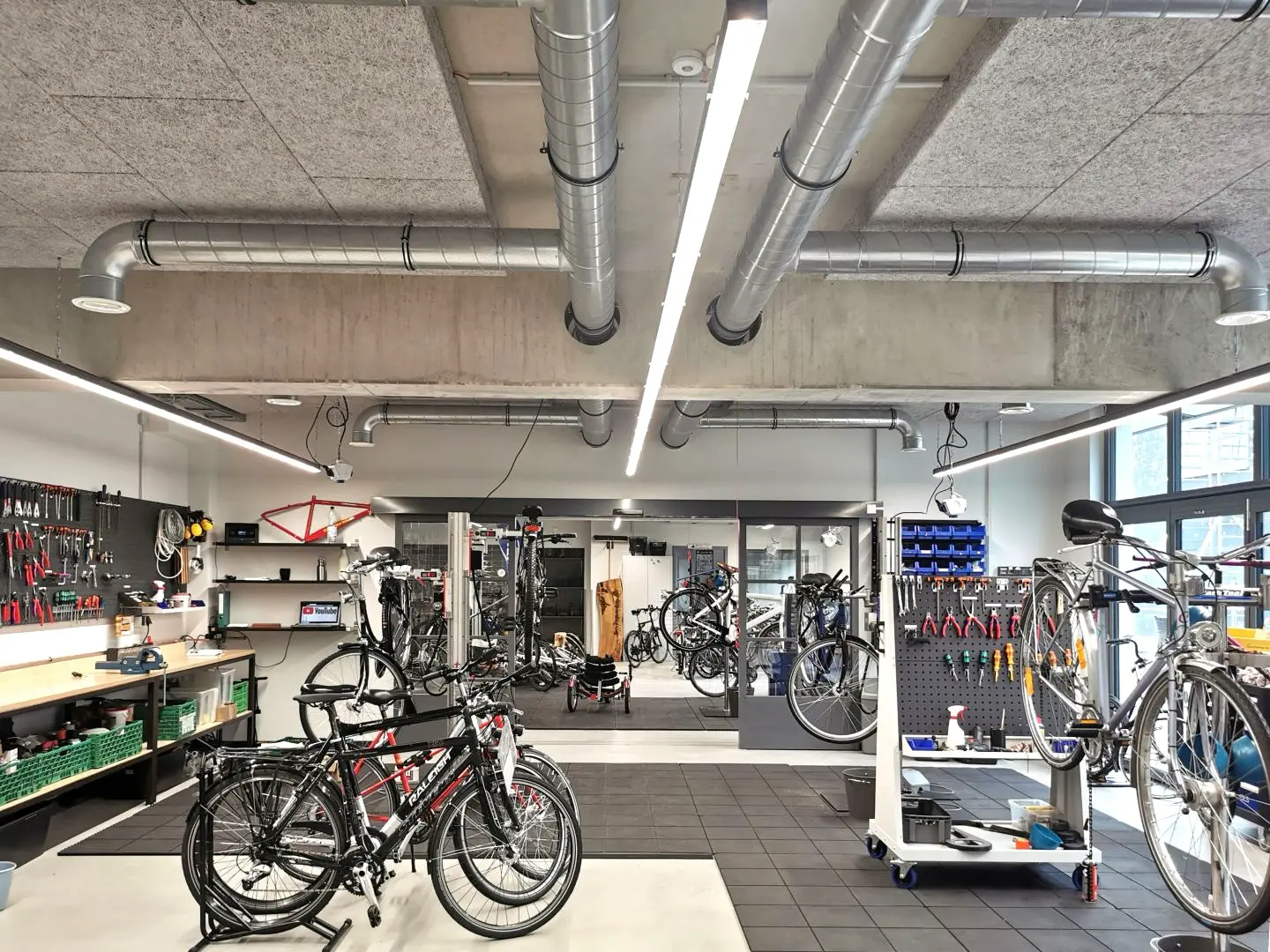 Neubau einer Fahrradwerkstatt mit Verkaufsfläche und zwei Wohneinheiten. Das Gebäude vereint eine Gewerbeeinheit mit Laden und Werkstatt sowie Wohnraum für Menschen mit Beeinträchtigung.