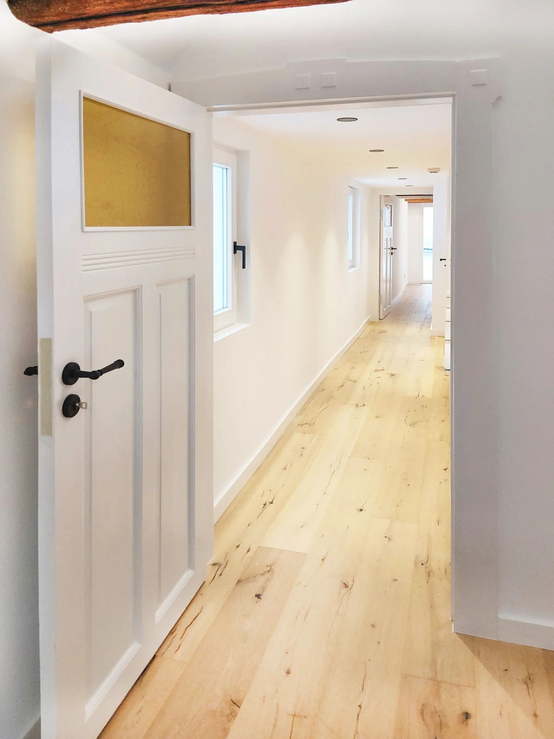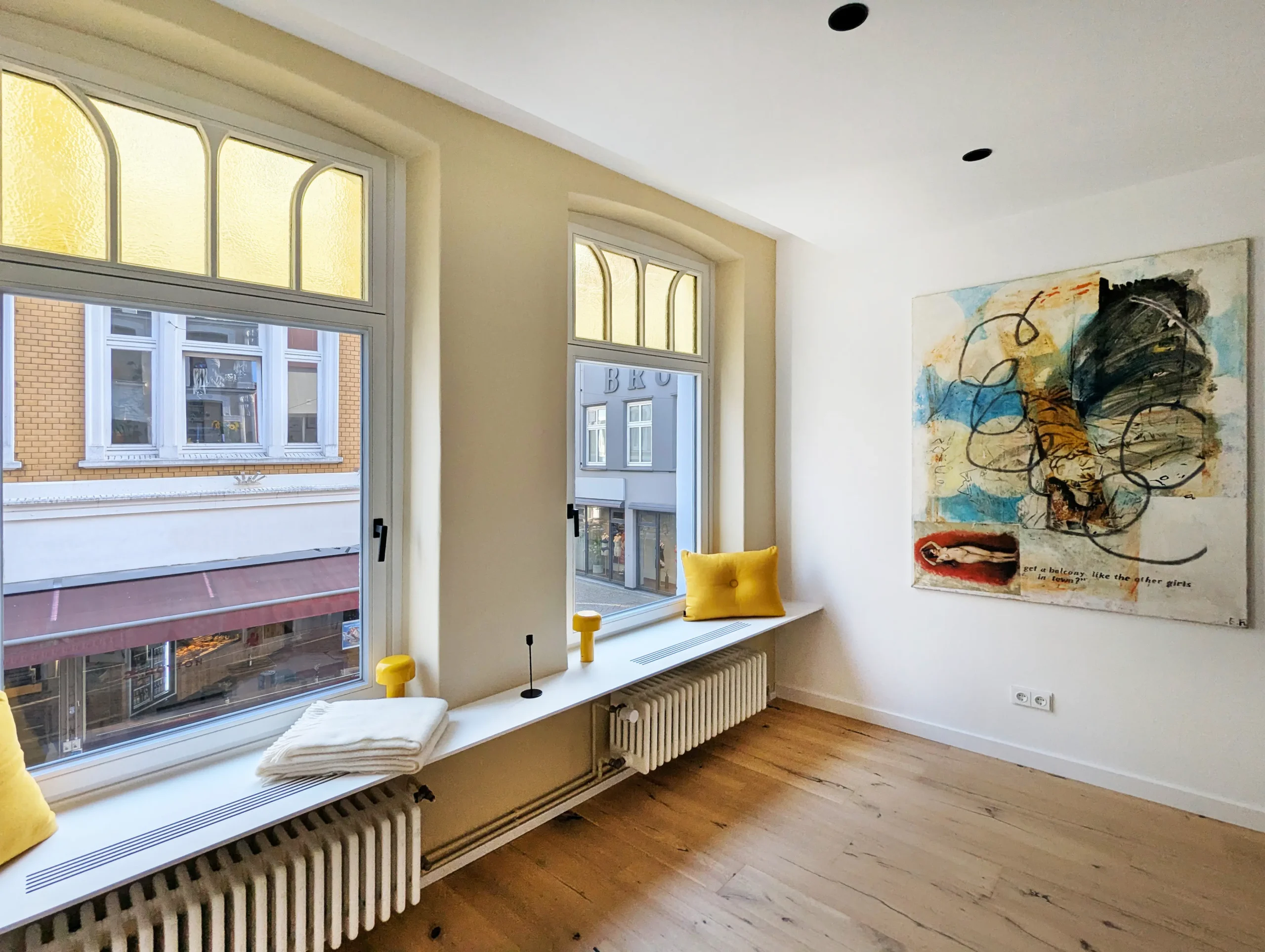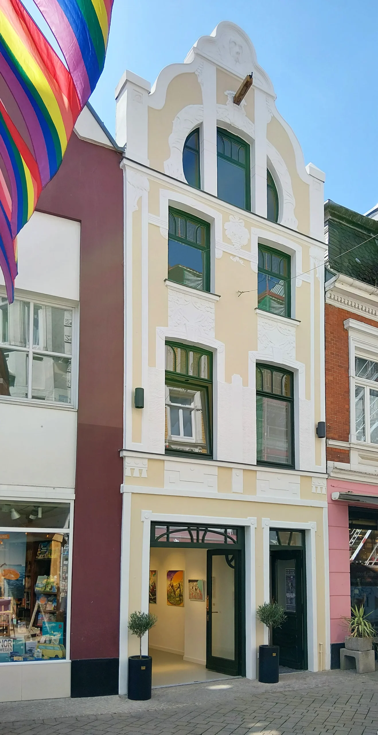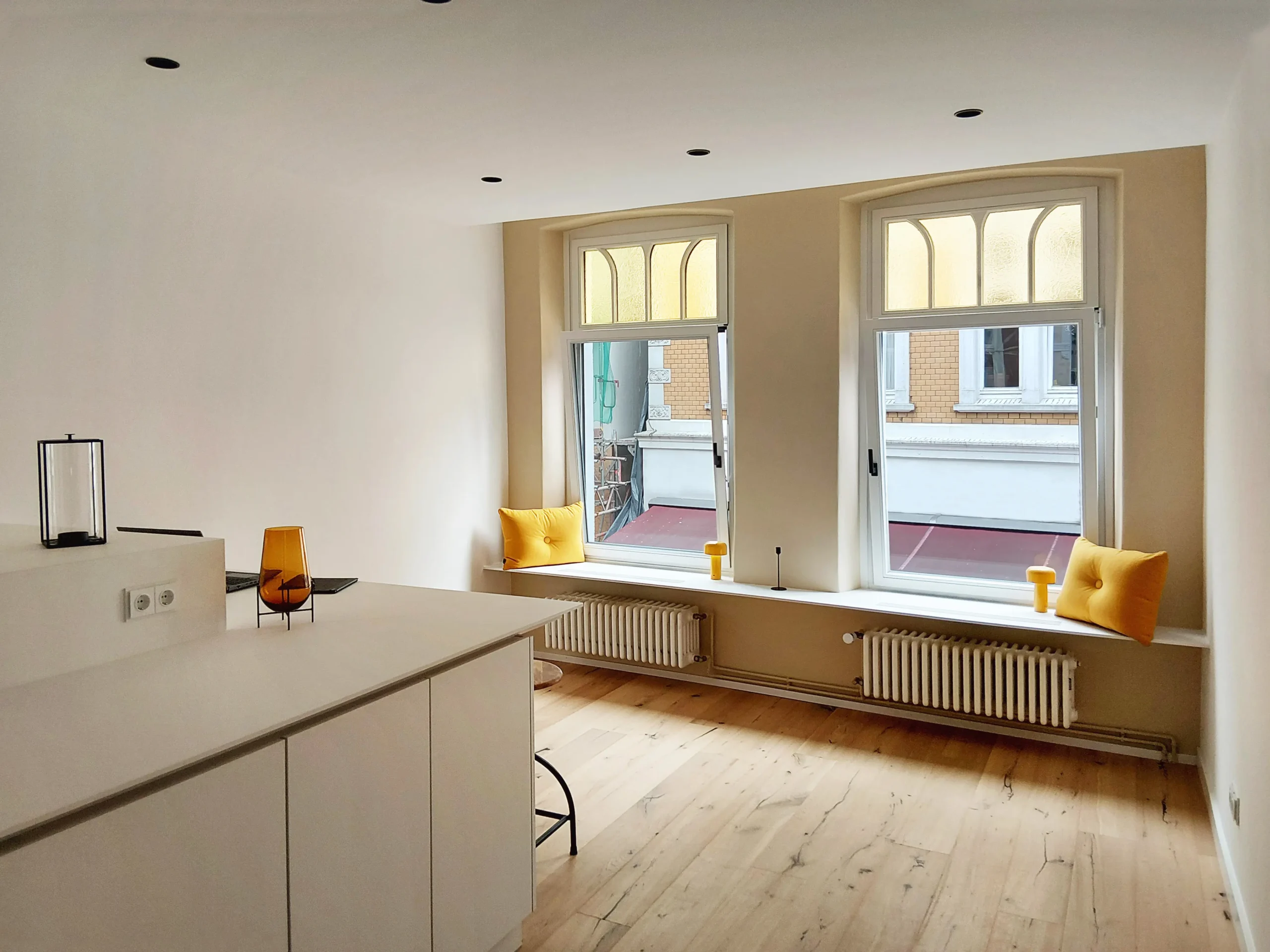 Das denkmalgeschützte Haus aus dem Jahr 1701 wurde im Zuge der Jahrhunderte mehrfach umgebaut. Die letzten Jahre vor dem Umbau stand das Haus, welches ausschließlich gewerblich genutzt wurde, leer, war dunkel und komplett verbaut. Im Zuge des Umbaus wurden die oberen Geschosse zu zwei Wohnungen mit ca. 45m² Wohnfläche umgebaut. Störende Elemente wurden entfernt und Sichtachsen, die durch das 15m lange Gebäude führen, geschaffen. Die rückwertige Terrasse und der Balkon wurden wieder reaktiviert und als kleine Oasen inmitten der Innenstadt geschaffen. Lediglich kleine Nasszellen wurden in den Geschossen hinzugefügt. Ansonsten sind die Wohnungen durch die Offenheit sehr großzügig. Im Erdgeschoss ist ein offener und minimalistischer Galeriebereich entstanden. Die kleine Nasszelle und ein Lagerraum liegen im hinteren Galeriebereich. Das Gebäude wurde vor einigen Jahren bereits energetisch saniert. Bei unserem Umbau wurden die Fenster nach dem historischen Vorbild in Abmessungen, Materialität und Farbe nachgebaut. Weitere Umbauten waren die Aufarbeitung der Jugendstilfassaden, der noch vorhandenen alten Türen, der Holztreppe und der freigelegten Deckenbalken im 2. Obergeschoss. Neue Einbauten erfolgten in zurückhaltende Materialien und hellen Farben. Der Umbau erfolgte in enger Zusammenarbeit mit den Denkmalschutzbehörde. So wurde ein Ort geschaffen, ein Lebensraum für Menschen, die mitten in der Stadt wohnen wollen, der auch außerhalb der Öffnungszeiten der Geschäfte belebt bleibt.