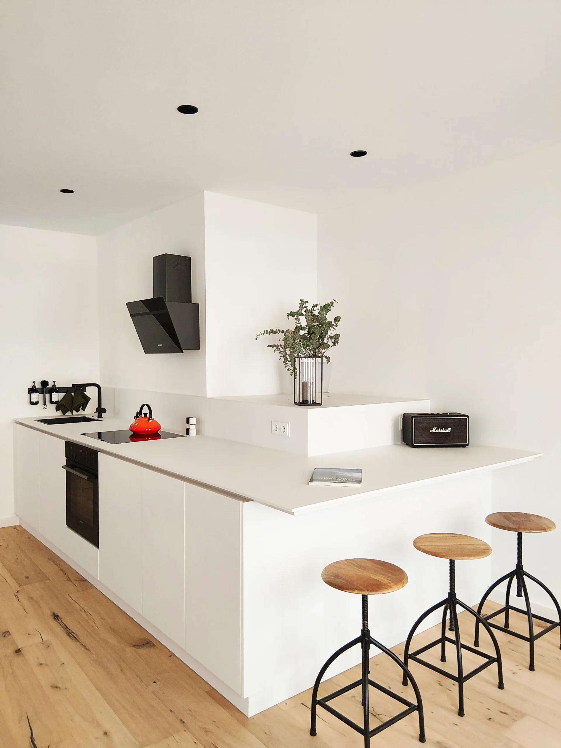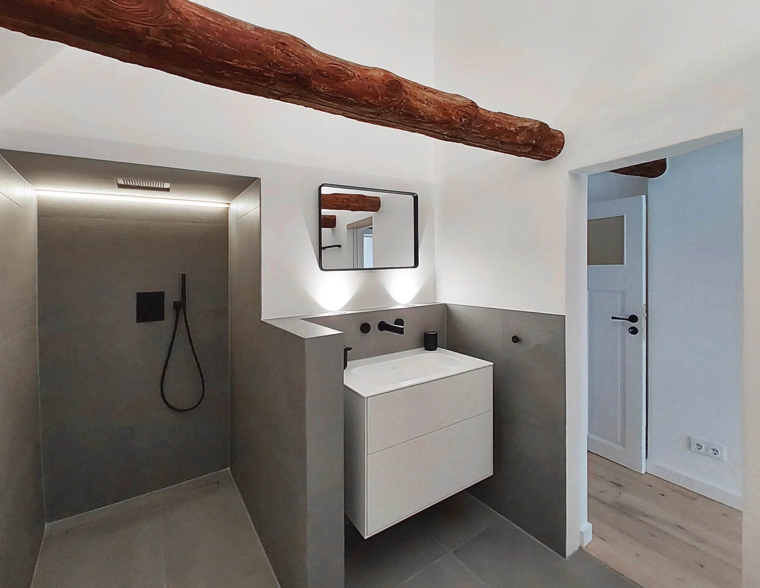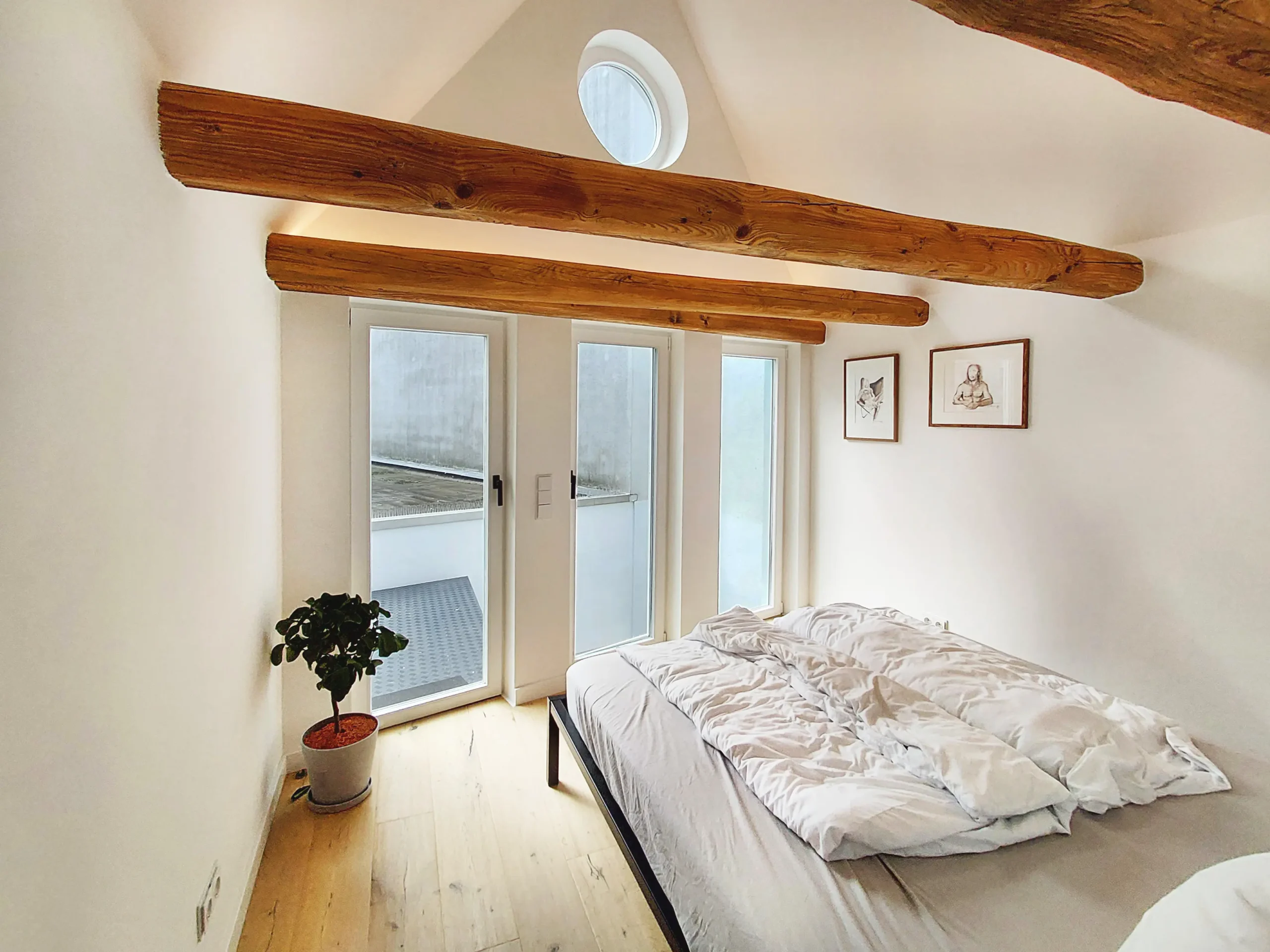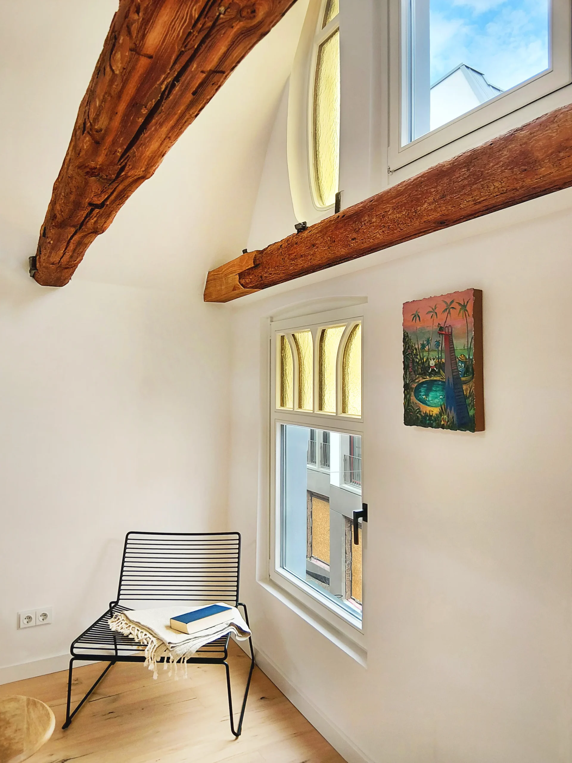 Das denkmalgeschützte Haus aus dem Jahr 1701 wurde im Zuge der Jahrhunderte mehrfach umgebaut. Die letzten Jahre vor dem Umbau stand das Haus, welches ausschließlich gewerblich genutzt wurde, leer, war dunkel und komplett verbaut. Im Zuge des Umbaus wurden die oberen Geschosse zu zwei Wohnungen mit ca. 45m² Wohnfläche umgebaut. Störende Elemente wurden entfernt und Sichtachsen, die durch das 15m lange Gebäude führen, geschaffen. Die rückwertige Terrasse und der Balkon wurden wieder reaktiviert und als kleine Oasen inmitten der Innenstadt geschaffen. Lediglich kleine Nasszellen wurden in den Geschossen hinzugefügt. Ansonsten sind die Wohnungen durch die Offenheit sehr großzügig. Im Erdgeschoss ist ein offener und minimalistischer Galeriebereich entstanden. Die kleine Nasszelle und ein Lagerraum liegen im hinteren Galeriebereich. Das Gebäude wurde vor einigen Jahren bereits energetisch saniert. Bei unserem Umbau wurden die Fenster nach dem historischen Vorbild in Abmessungen, Materialität und Farbe nachgebaut. Weitere Umbauten waren die Aufarbeitung der Jugendstilfassaden, der noch vorhandenen alten Türen, der Holztreppe und der freigelegten Deckenbalken im 2. Obergeschoss. Neue Einbauten erfolgten in zurückhaltende Materialien und hellen Farben. Der Umbau erfolgte in enger Zusammenarbeit mit den Denkmalschutzbehörde. So wurde ein Ort geschaffen, ein Lebensraum für Menschen, die mitten in der Stadt wohnen wollen, der auch außerhalb der Öffnungszeiten der Geschäfte belebt bleibt.