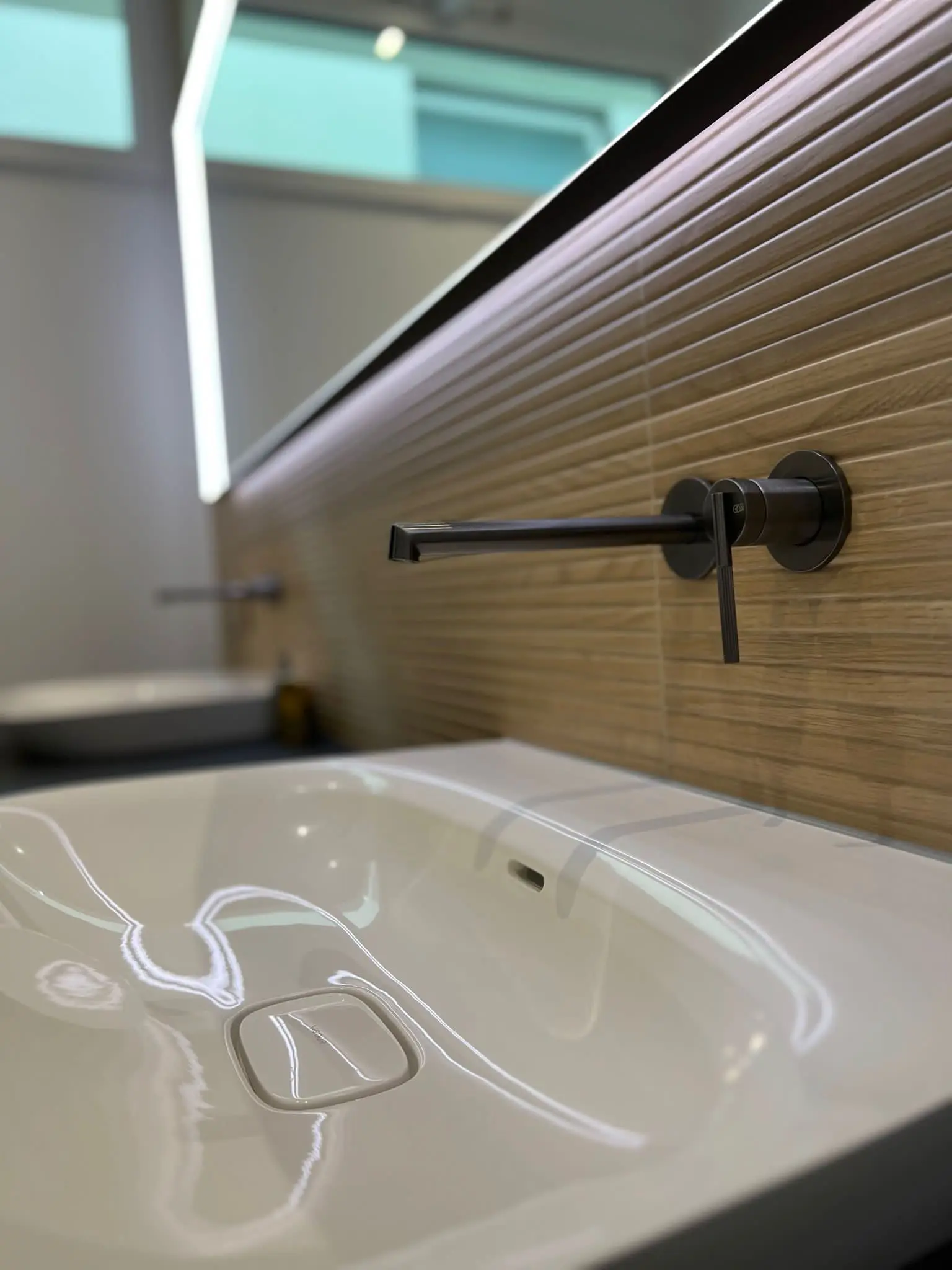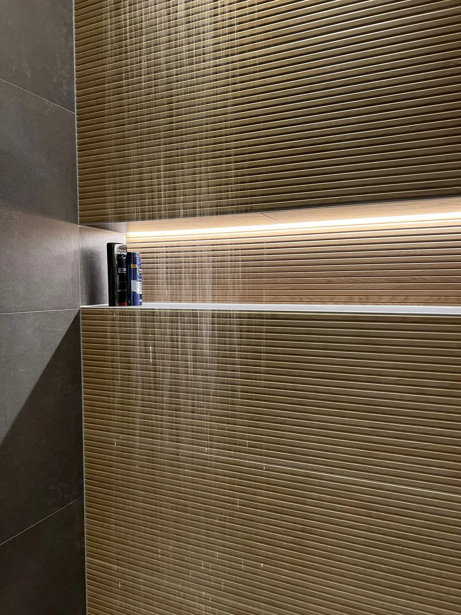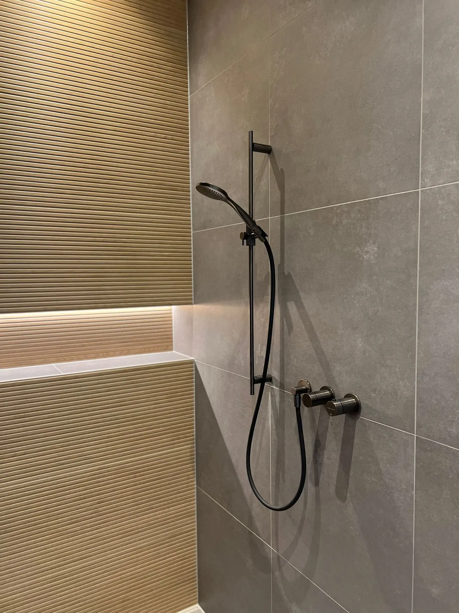 Das bereits entkernte Badezimmer in der 1892 erbauten denkmalgeschützten Villa wurde umfassend saniert. Die vormals dunkle Duschnische wurde zu einem großzügigen bodentiefen Duschbereich mit einer Regendusche umfunktioniert. Die in der Vorwand eingelassene Ablage, welche zusätzlich eine indirekte Beleuchtung erhalten hat, rundet den neuen Duschbereich ab. Ein individuell entworfener Waschtischunterschrank sorgt für ausreichend Stauraum und Platz für zwei Waschtische mit Ablagefläche. Der große, indirekt beleuchtete Spiegel über die gesamte Breite des Waschtischbereichs vergrößert den Raum optisch und schafft eine gemütliche Atmosphäre. Die gewählten hochwertigen Materialien bestimmen die Neugestaltung des Badezimmers. Die Armaturen wurden in schwarz matt gewählt. Dies schafft zusammen mit den großformatigen Fliesen in grau mit Akzentuierungen durch geriffelte Fliesen in Holzoptik den modernen wie auch warmen Charakter der neuen Badgestaltung. Abgerundet wird die Badsanierung mit einem neuen Design-Handtuchheizkörper. Der Erdgeschossgrundriss wurde im Rahmen eines Bauantragsverfahrens mit anschließender Ausführungsplanung umgestaltet. Der Grundriss wurde neu strukturiert und Zonen ausgebildet. Eine offene Achse mit Blick in den Garten wurde geschaffen. Der neue Küchenbereich wurde im Detail geplant und zum Esszimmer geöffnet. Ziel war zudem die Einbindung und Hervorhebung der historischen Stilelemente. In den vorhandenen Fußbodenaufbau wurde eine Fußbodenheizung eingesetzt, sodass auf die großflächigen Heizkörper verzichtet werden konnte. Die Deckenhöhen von über drei Meter in Verbindung mit der neuen Grundrissgestaltung und dem Platzieren eines Kamins sorgen zusätzlich für ein großzügiges und zugleich gemütliches Raumgefühl.