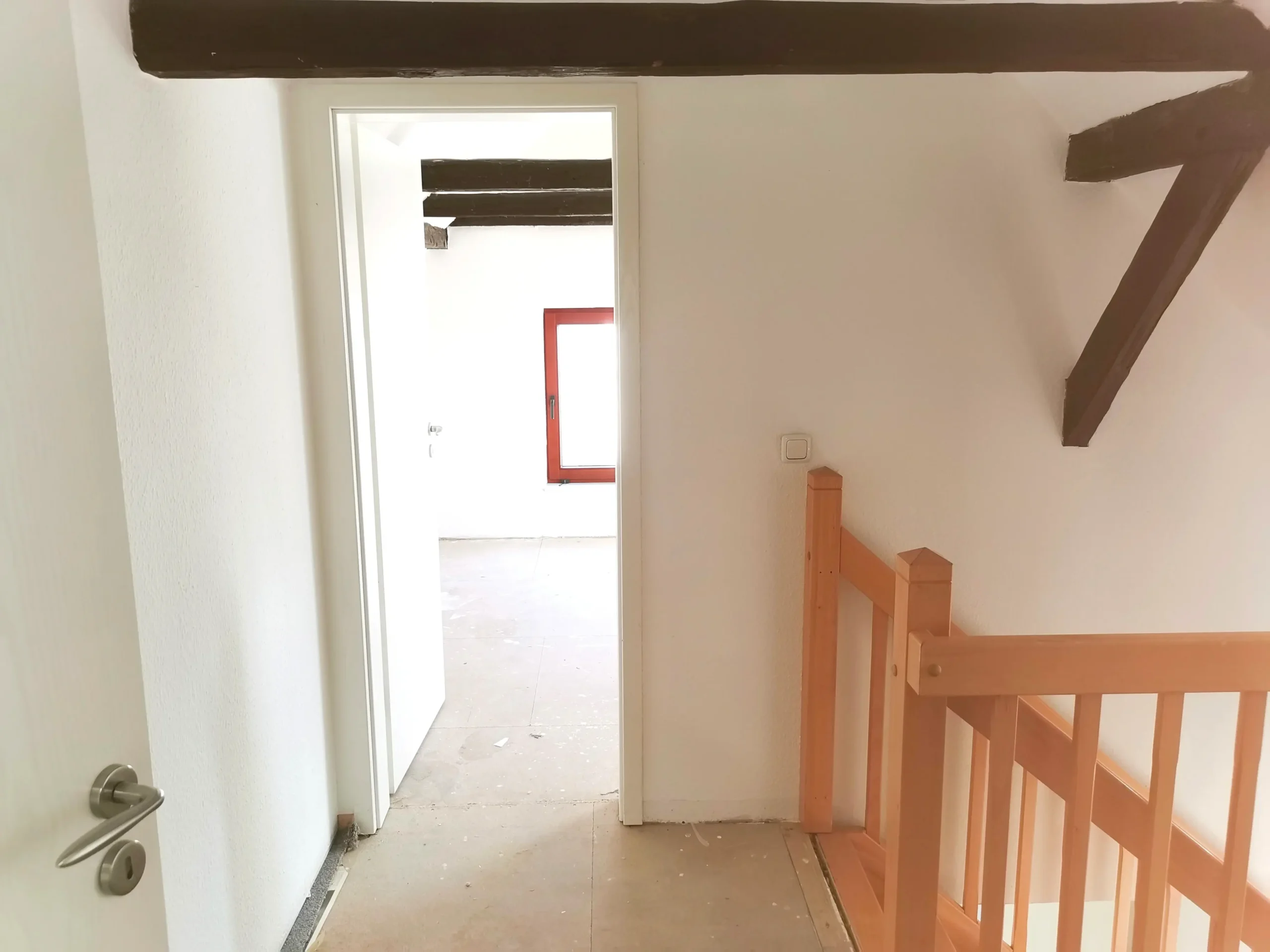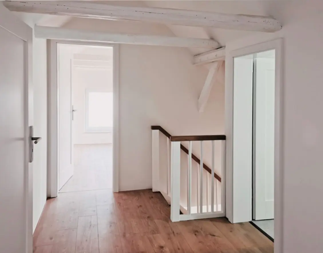 Das Einfamilienhaus aus dem 20. Jahrhundert wurde bereits Anfang der 2000er-Jahre umfassend saniert und befand sich energetisch in einem guten Zustand. Mit den neuen Eigentümern entstanden jedoch veränderte Anforderungen an die Grundrissgestaltung. In enger Zusammenarbeit mit den Bauherren wurde ein optimierter Grundriss entwickelt, der gezielt auf die Bedürfnisse der Familie eingeht. Ein zentrales Thema war dabei die Umplanung der Treppe, die im Bestand einen Großteil des Flures eingenommen hatte. Die neue Treppe ist deutlich kompakter gestaltet und bietet zusätzlich integrierte Abstellflächen unterhalb der Treppe und in den unteren Treppenstufen. Dadurch präsentiert sich der Eingangsbereich nun offen, übersichtlich und funktional. Auch den Bädern kam im Zuge der Umgestaltung eine besondere Bedeutung zu. Diese wurden neu strukturiert, wobei das Bad im Dachgeschoss vergrößert werden konnte, sodass nun auch Platz für eine Badewanne vorhanden ist. Klassische Metrofliesen wurden bewusst gewählt und durch ihre senkrechte Verlegung modern und zeitlos interpretiert. Aufgesetzte Waschbecken sowie schwarze Armaturen unterstreichen diese Gestaltung. Im Erdgeschoss wurde eine Fußbodenheizung in den bestehenden Estrich eingefräst, während im Dachgeschoss die vorhandenen Heizkörper erhalten blieben. Ergänzend wurde eine neue Luft-Wasser-Wärmepumpe installiert, die künftig durch eine Photovoltaikanlage unterstützt werden soll. Die Fassade wurde instandgesetzt und neu gestrichen, sodass sich das moderne Erscheinungsbild des Innenraums nun auch nach außen widerspiegelt.