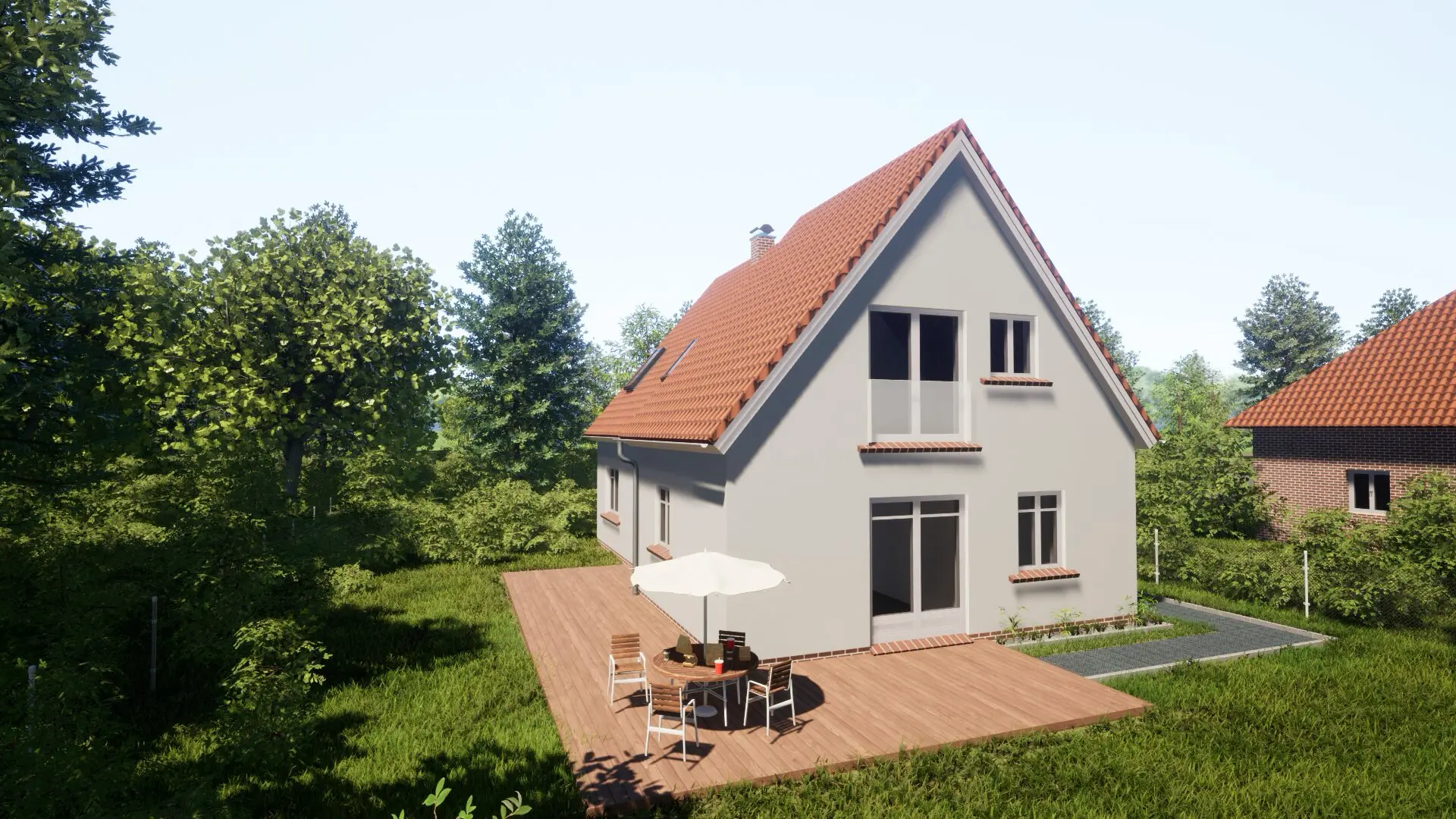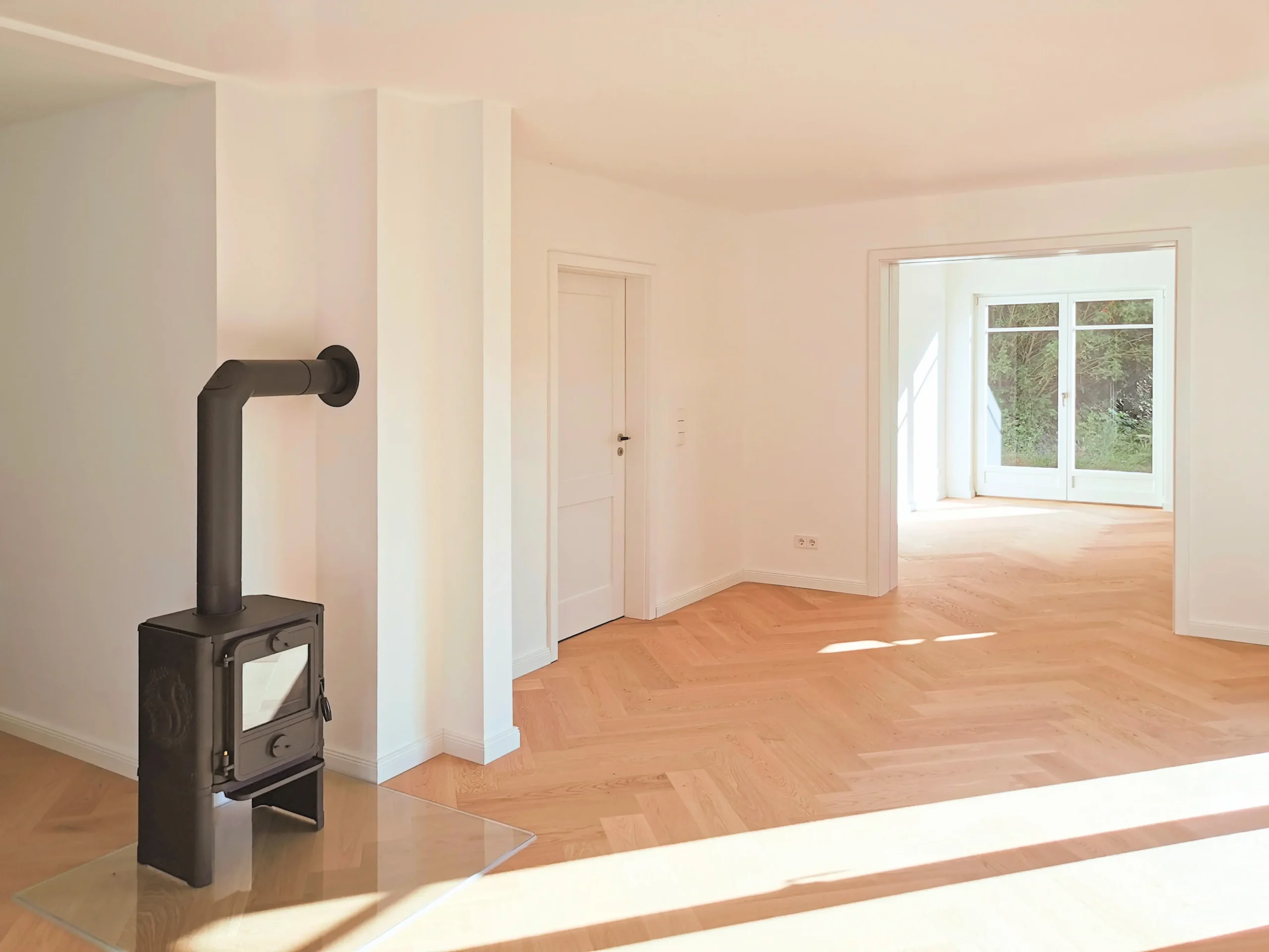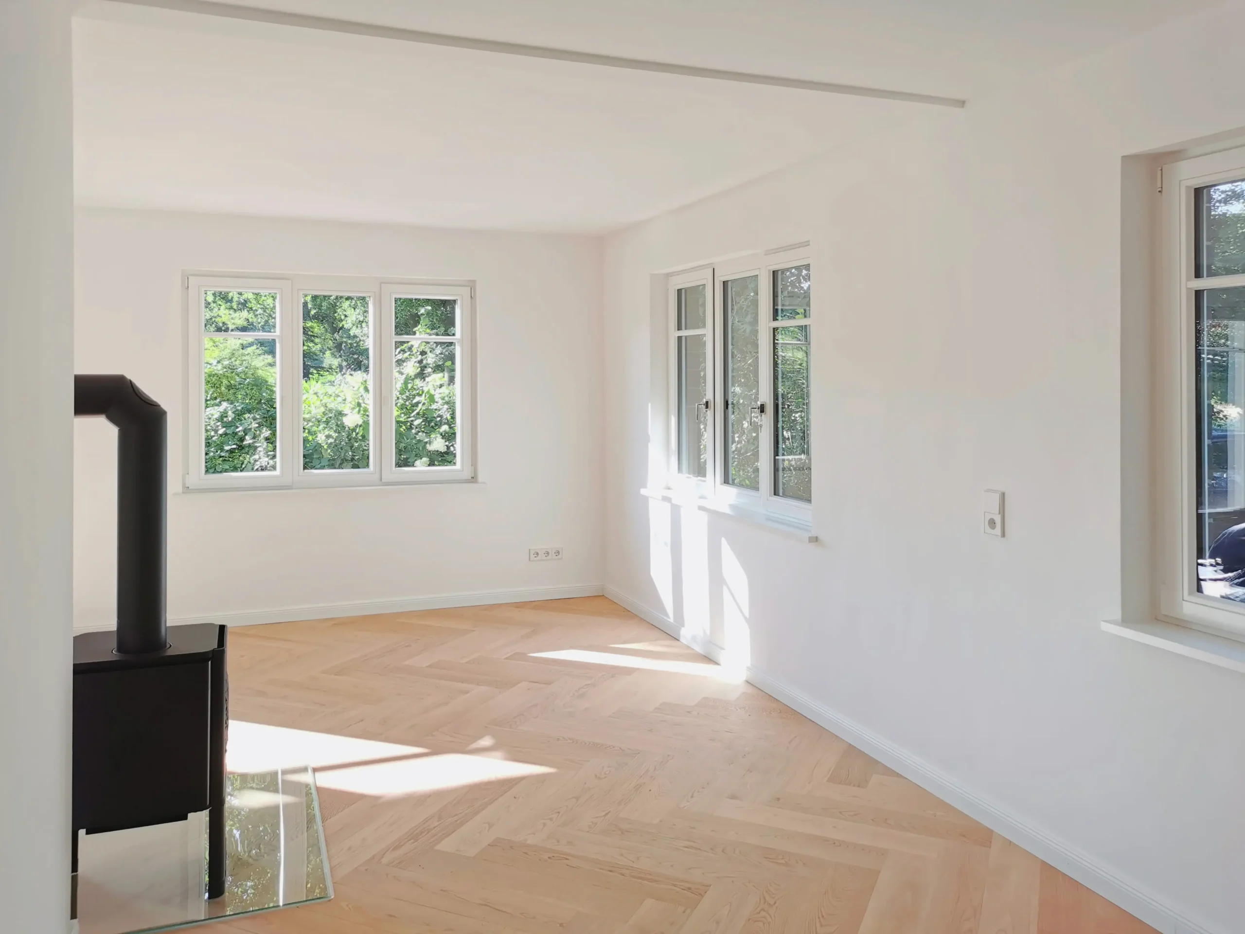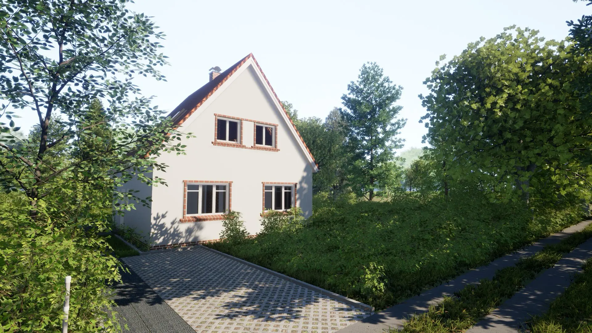 Das Einfamilienhaus aus den 1930er-Jahren liegt im Außenbereich und ist von Natur umgeben. Hinter dem Vorderhaus befand sich ursprünglich ein abgängiger, eingeschossiger Stall, der durch einen Anbau in Holzrahmenbauweise ersetzt wurde. Das gesamte Gebäude erreicht mit dem Umbau den Energiestandard 85 EE. Durch den Anbau wurde das Wohnhaus sinnvoll erweitert und bietet heute vielfältige Räume für das Leben einer Familie. Im Erdgeschoss wurde die Raumstruktur geöffnet, wodurch ein großzügiger, offener Wohnbereich entstanden ist. Das Obergeschoss beherbergt die Schlafräume sowie eine Ankleide und ein Büro. Die Bäder wurden vollständig neu hergestellt, und die Treppe wurde in Anlehnung an ihr historisches Vorbild nachgebaut. Zur Erreichung des energetischen Standards wurden zahlreiche Maßnahmen umgesetzt. Im Vorderhaus wurde eine Kerndämmung eingebracht, während der Anbau vollständig in Holzrahmenbauweise ausgeführt wurde. Das Dach wurde erneuert und die ehemaligen Kunststofffenster durch Holzfenster ersetzt, die die ursprüngliche Fensteraufteilung wieder aufgreifen. Ergänzend wurden eine Luft-Wasser-Wärmepumpe und eine Photovoltaikanlage installiert. Im gesamten Gebäude sorgt eine Fußbodenheizung für zeitgemäßen Wohnkomfort. Besonderer Wert wurde daraufgelegt, den ursprünglichen Charme des Hauses wiederherzustellen. So wurde die vorgehängte Fassade im Giebelbereich entfernt und die charakteristischen Klinkerelemente der Fassade rekonstruiert. Auch die Fenster erhielten ihre ursprüngliche Gliederung zurück. Durch die behutsame Sanierung und den gelungenen Anbau wurde das Gebäude neu belebt und präsentiert sich heute als echter Blickfang innerhalb der Straße.